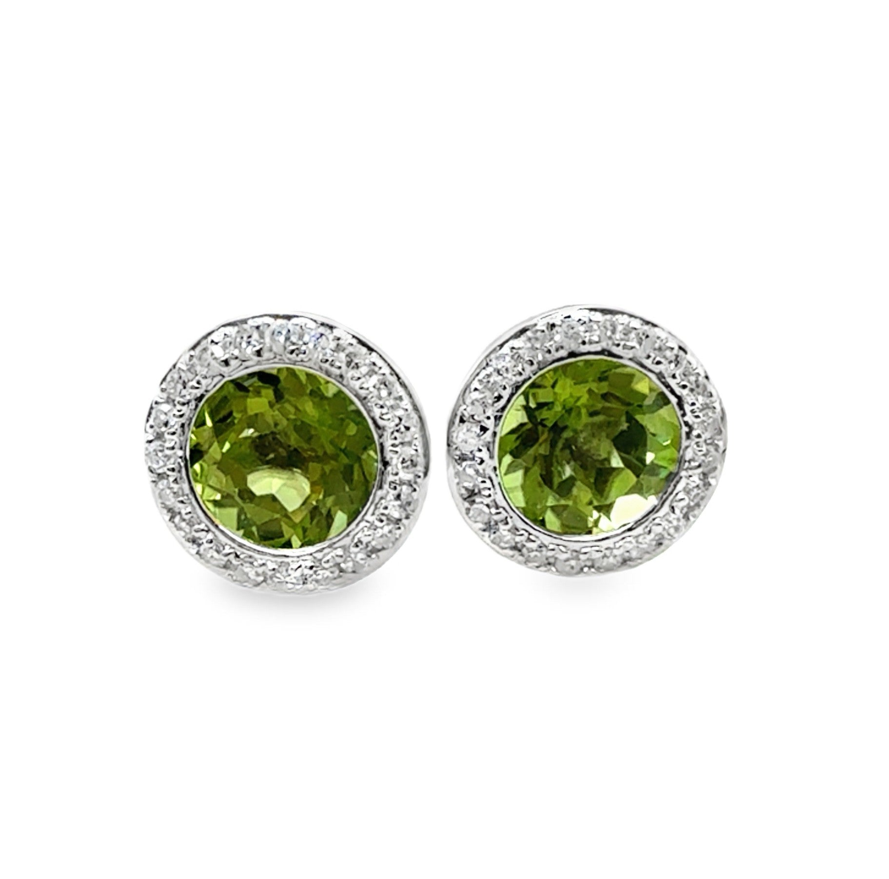 14K White Gold Halo Stud Earrings with Peridot 1.33CTTW and Diamonds D.11CTTW.