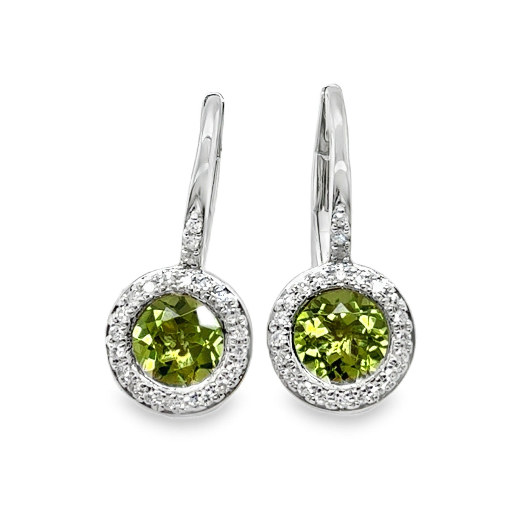 14K White Gold Leverback Earrings with Peridot 1.24CTTW and Diamonds D.13CTTW.