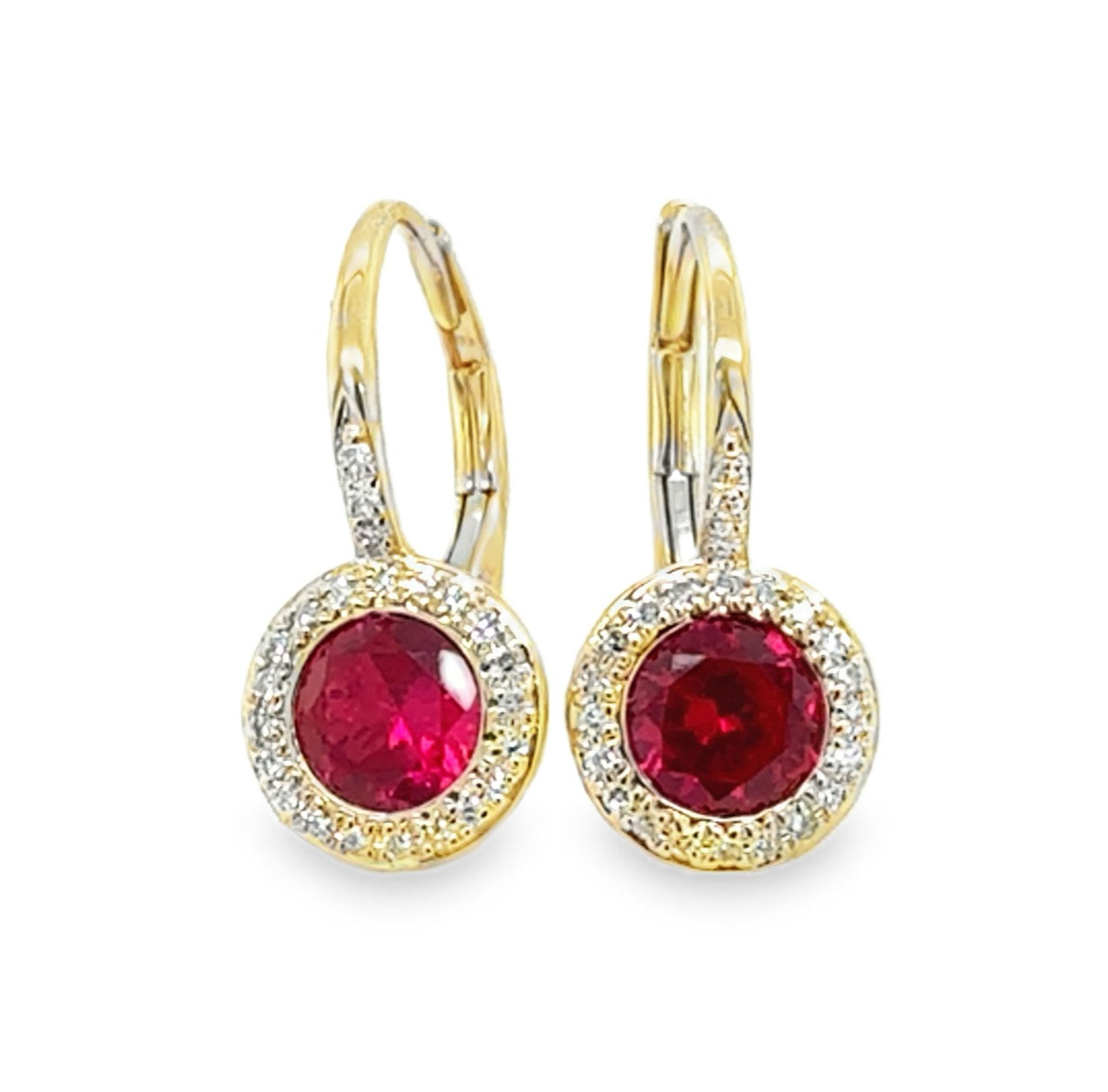 14K Yellow Gold Leverback Earrings with Red Corundum 1.61CTTW and Diamonds D.13CTTW.