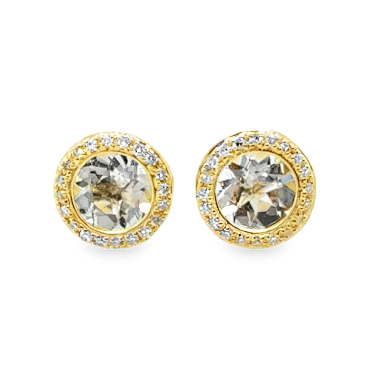 14K Yellow Gold Halo Stud Earrings with White Topaz 1.48CTTW and Diamonds D.11CTTW.