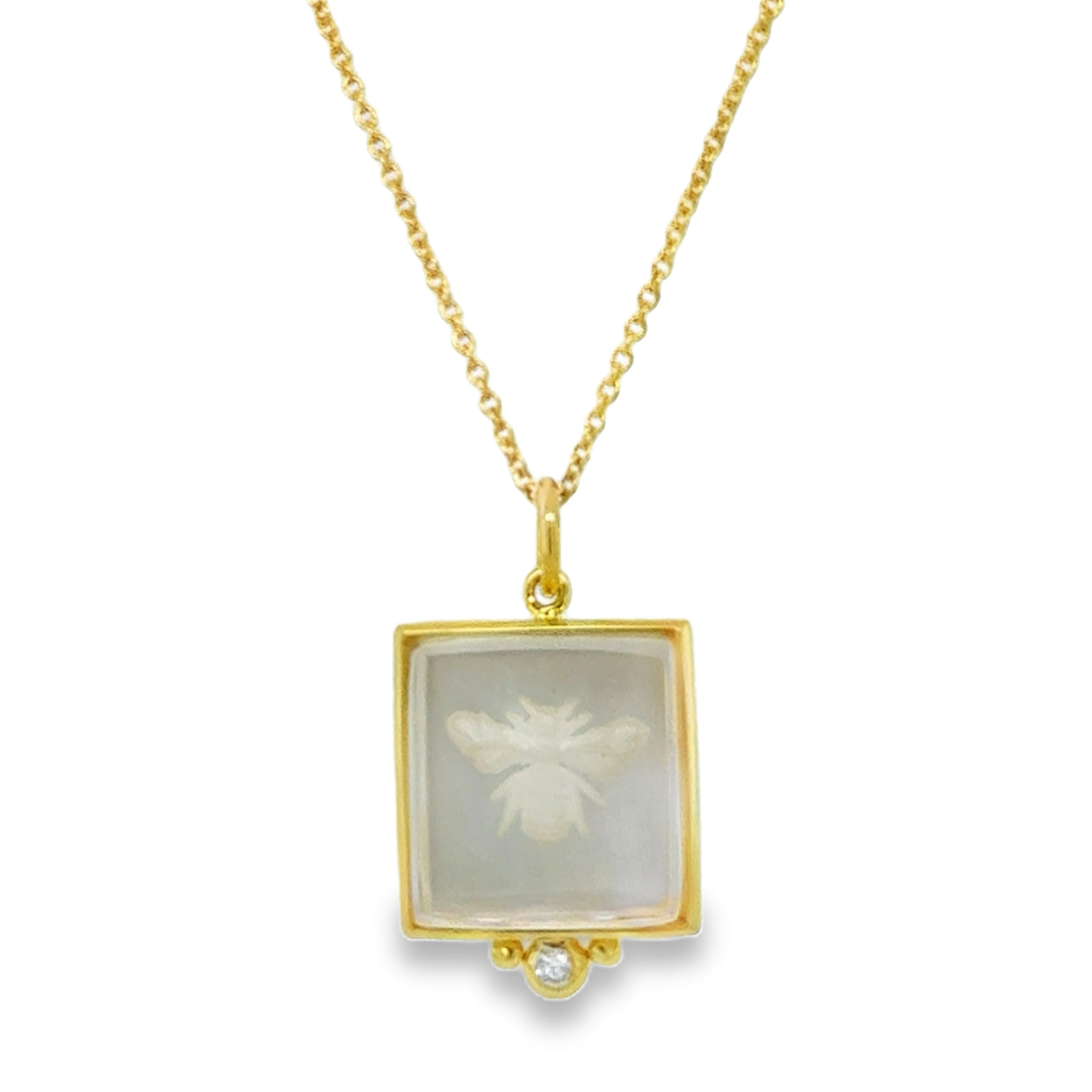 14K Yellow Gold Necklace with Square Crystal Carved With Bee and Diamonds D.03CT on a Cable Chain, 18"