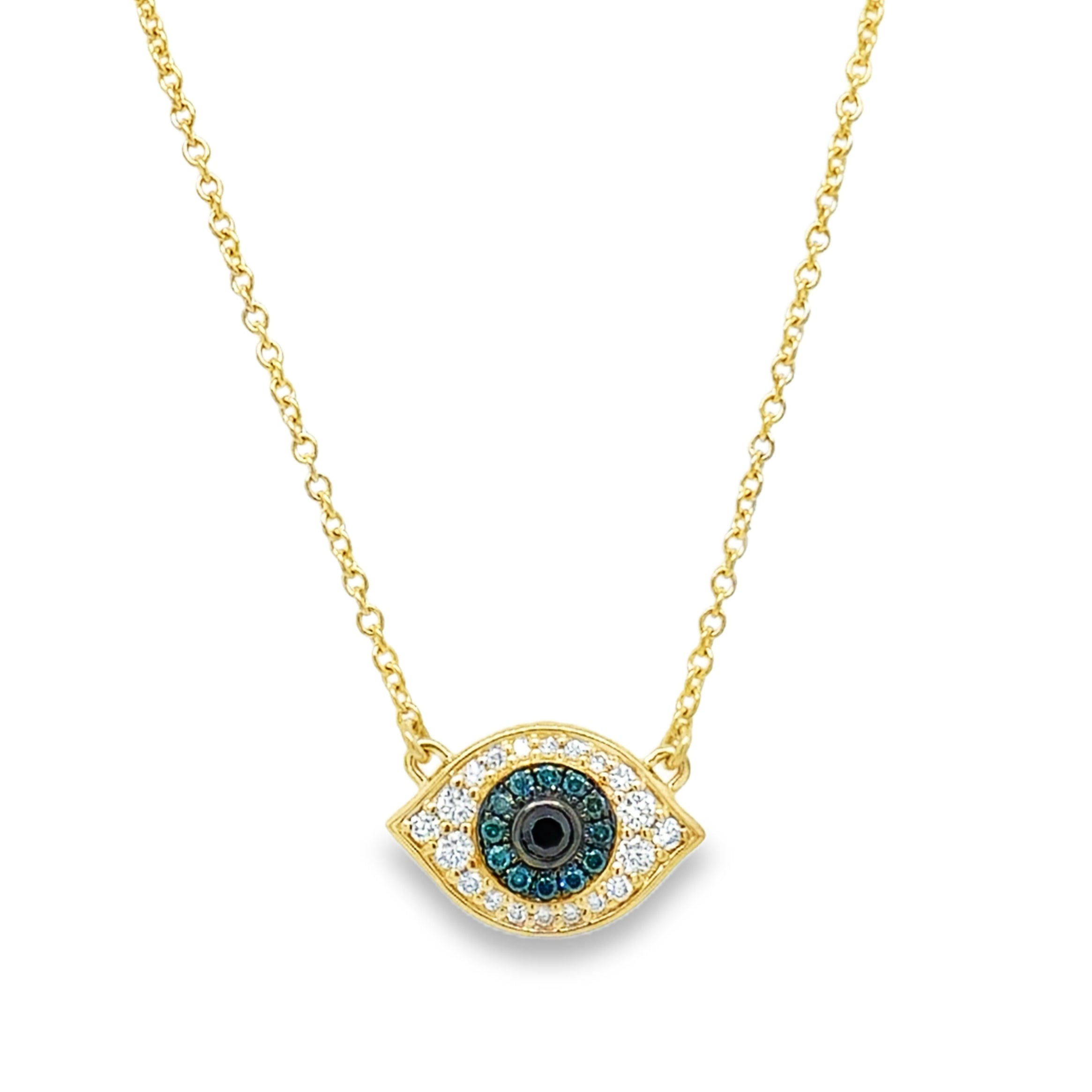 14K Yellow Gold Large Evil Eye Necklace with White, Blue and Black Diamonds D.34CTTW.