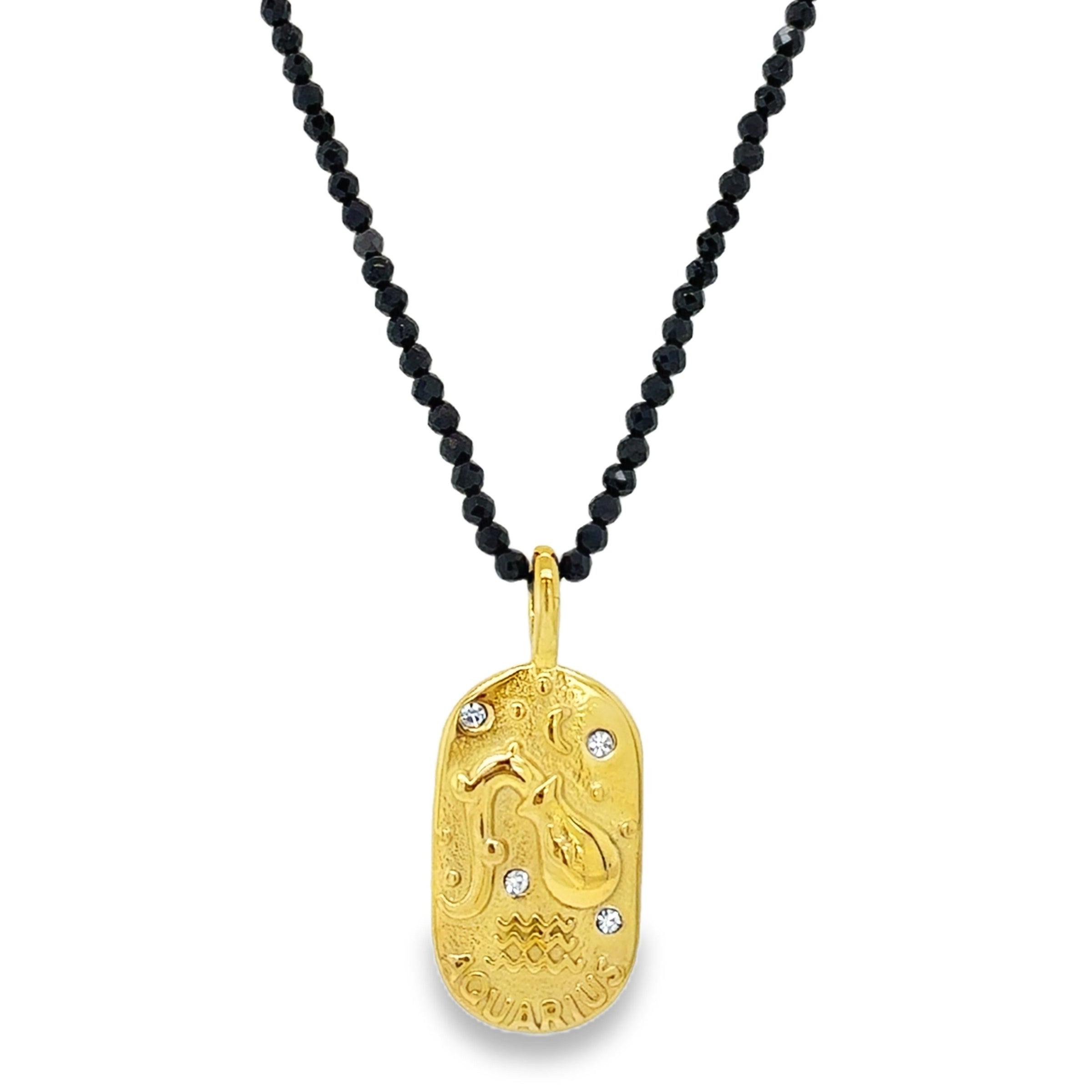 Gold Plated Stainless Steel Midnight Zodiac Necklace - Aquarius with Black Spinel and Cubic Zirconia.