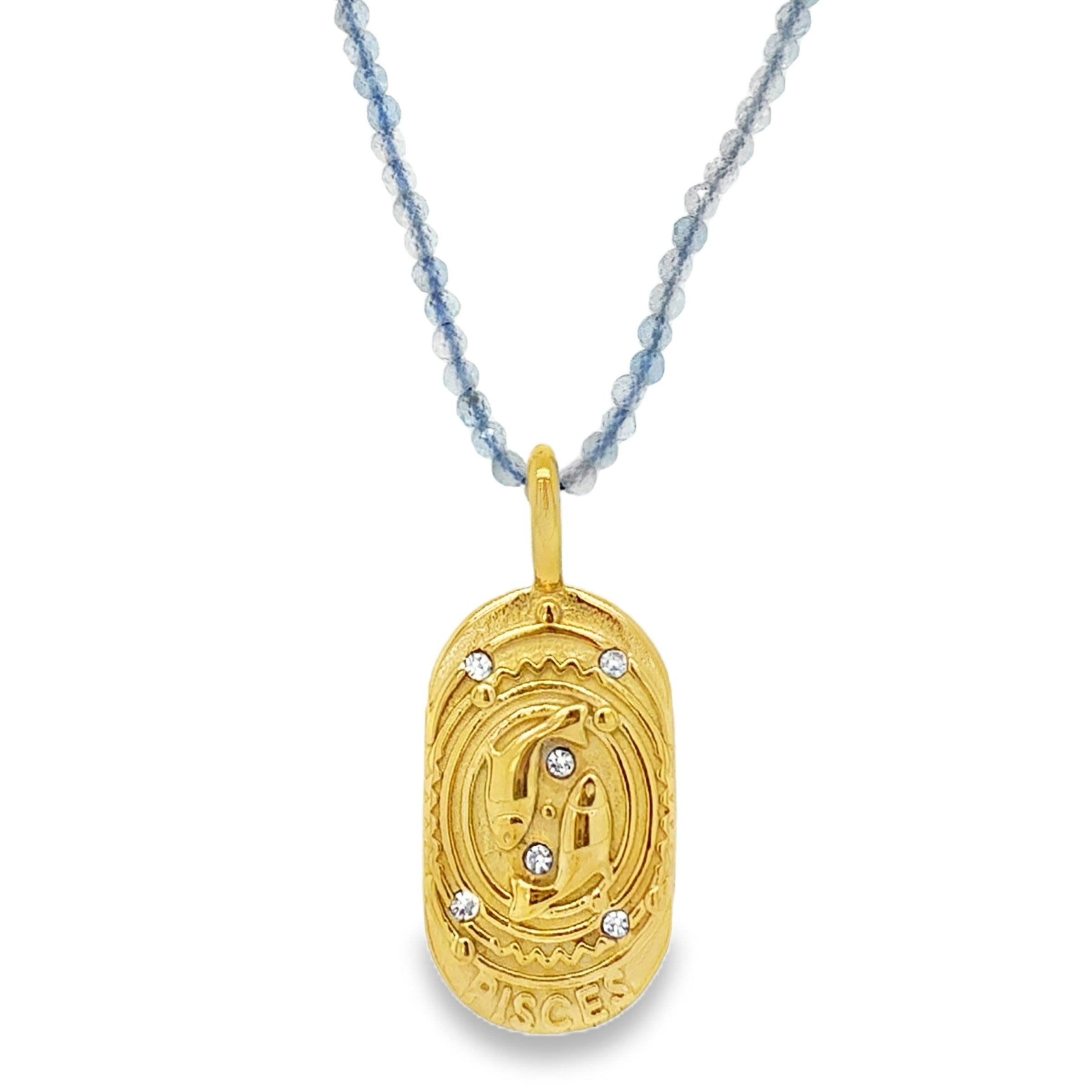 Gold Plated Stainless Steel Zodiac Necklace - Pisces with Light Blue Beads and Cubic Zirconia.