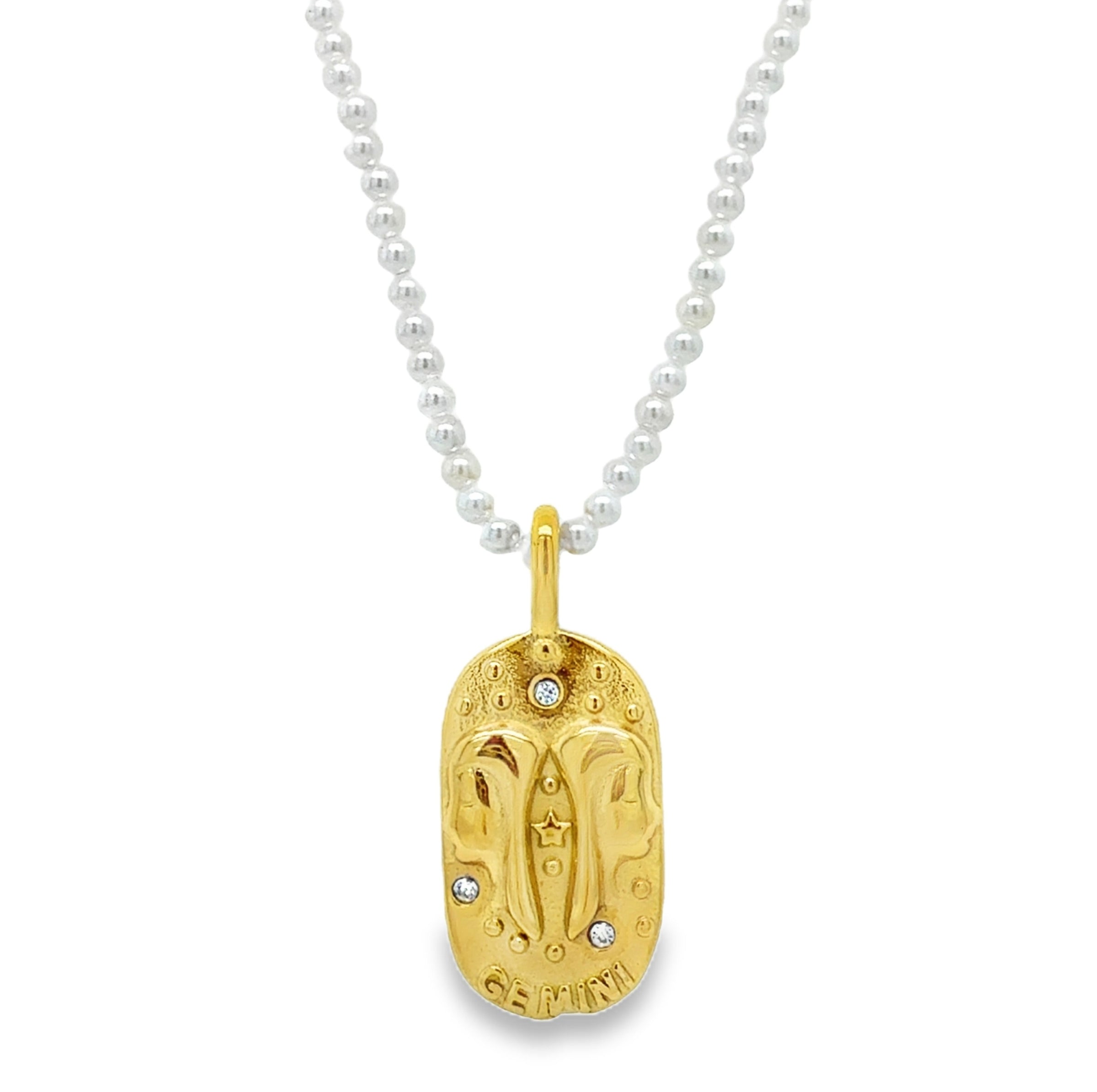 Gold Plated Stainless Steel Zodiac Necklace - Gemini with Pearls and Cubic Zirconia.