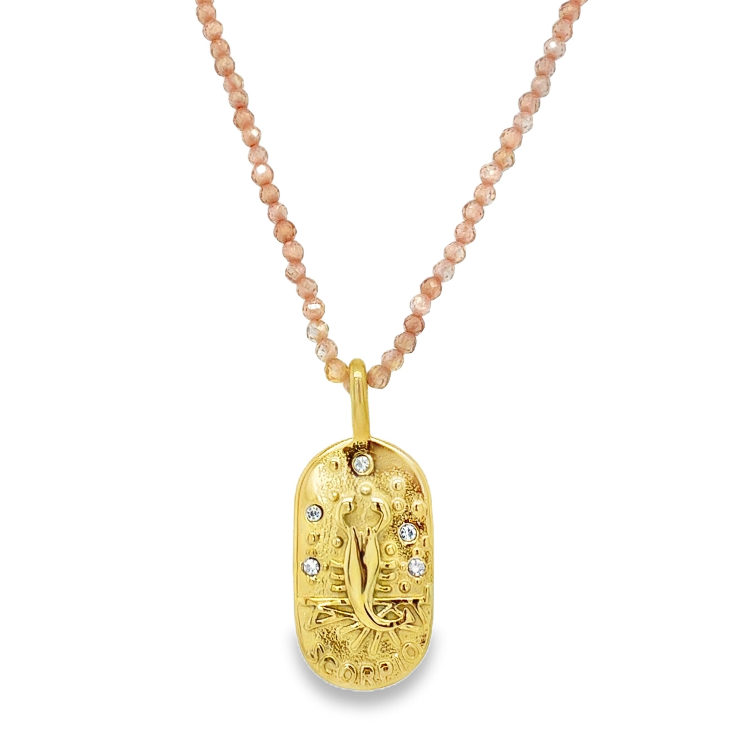 Gold Plated Stainless Steel Zodiac Necklace - Scorpio with Peach Beads and Cubic Zirconia.