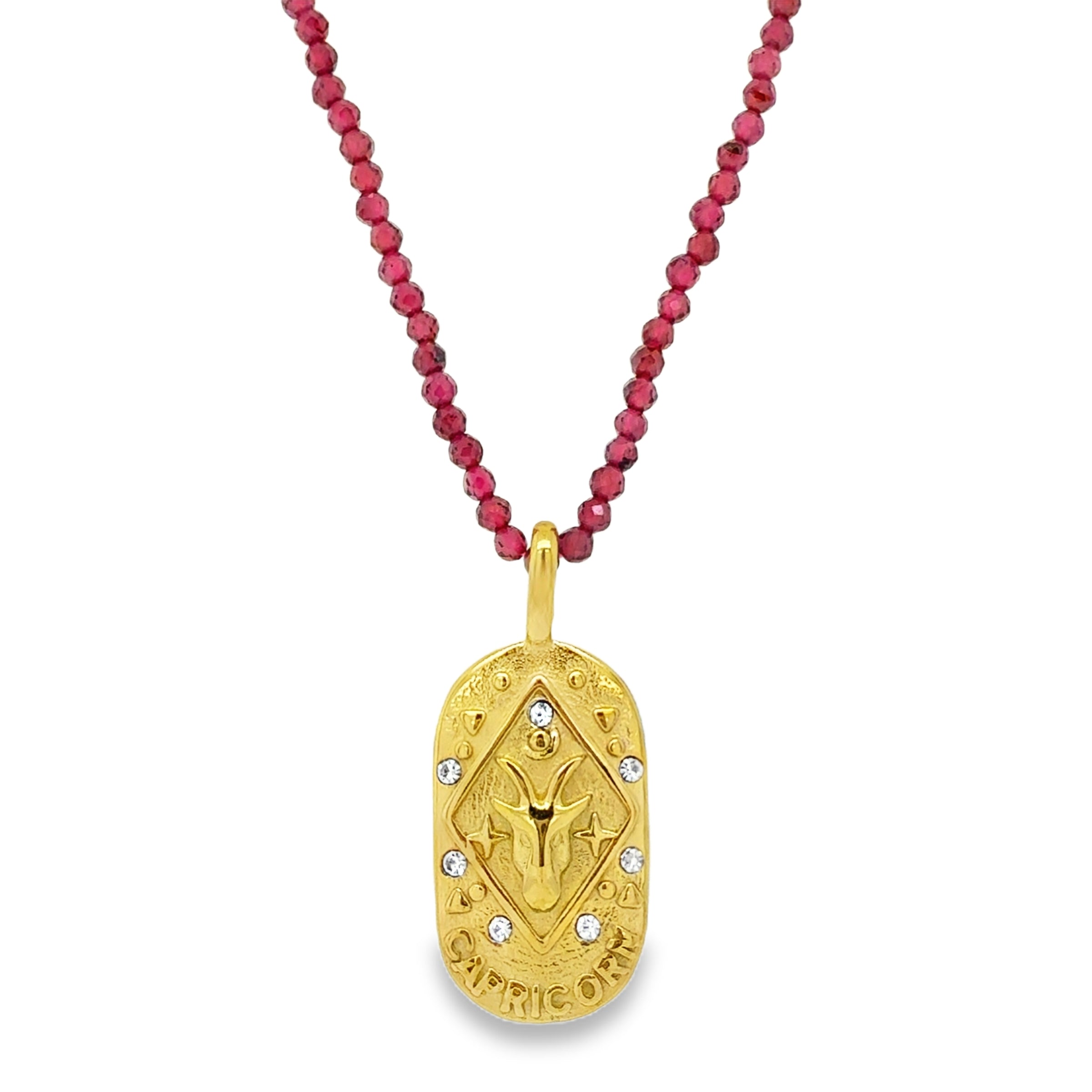 Gold Plated Stainless Steel Zodiac Necklace - Capricorn with Deep Red Beads and Cubic Zirconia.
