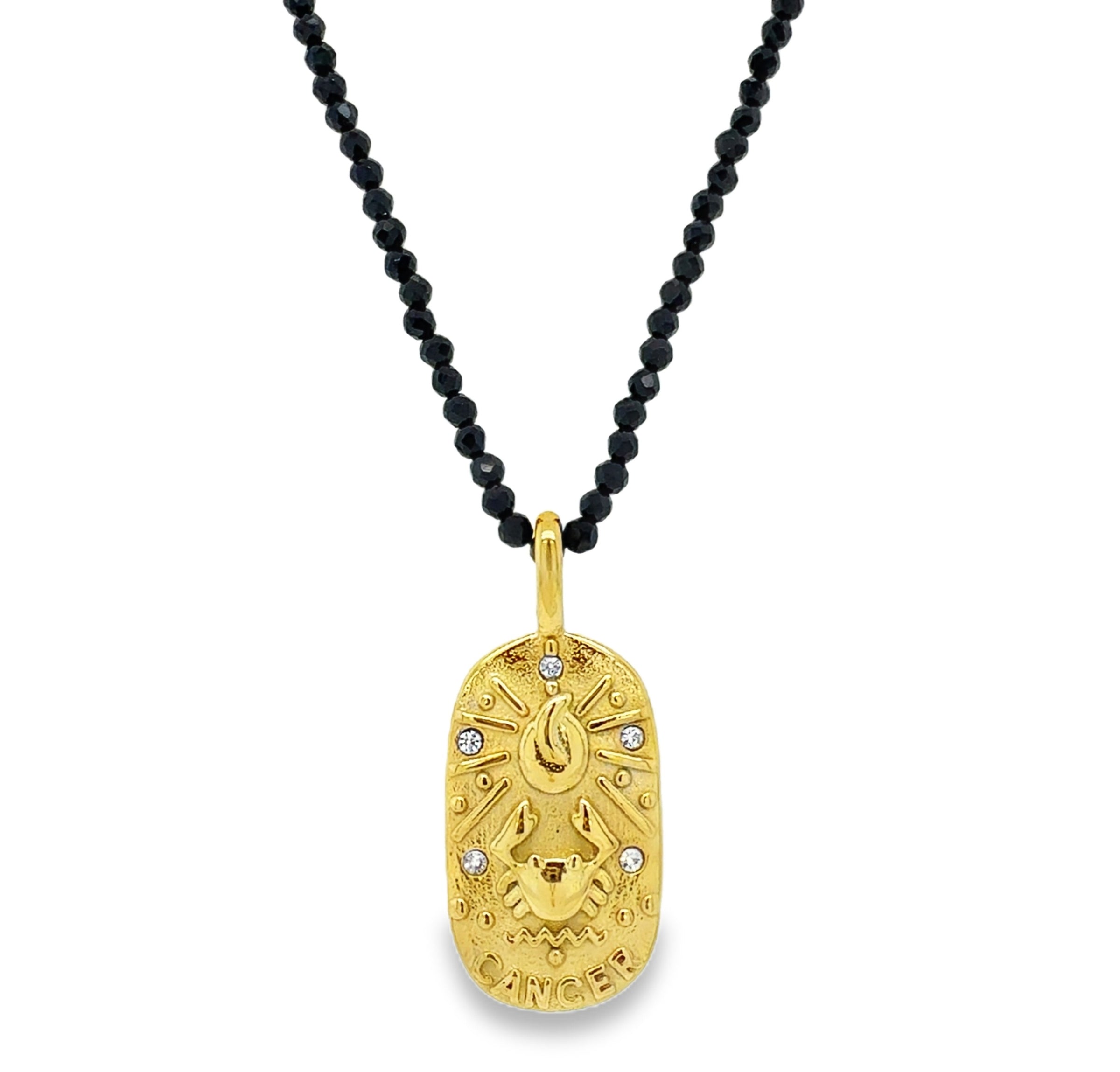 Black Spinel Cubic Zirconia Beaded Necklace with Gold Plated Stainless Steel Midnight Zodiac Necklace - Cancer Pendant.