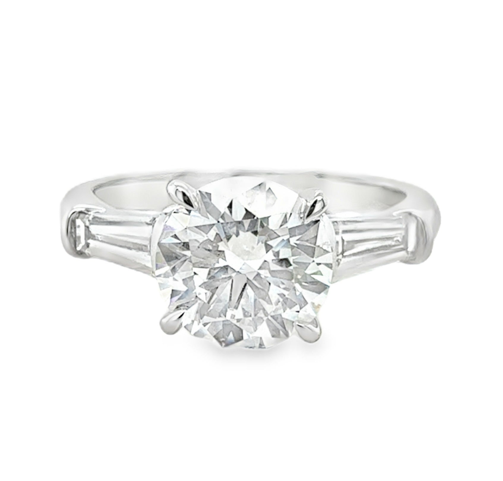 14K White Gold Ring with Center Round Lab Grown Diamond 2.00CT and (2) Baguette Cut Side Diamonds D.60CTTW, FG / VS