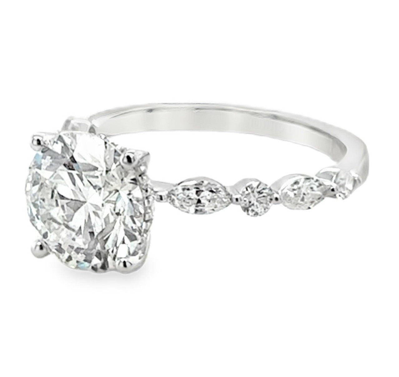 14K White Gold Ring with Center Round Lab Grown Diamond 2.00CT and (4) Marquise Cut 2 X 4MM , (4) Round 2MM Side Diamonds D.50CTTW. FG/VS.