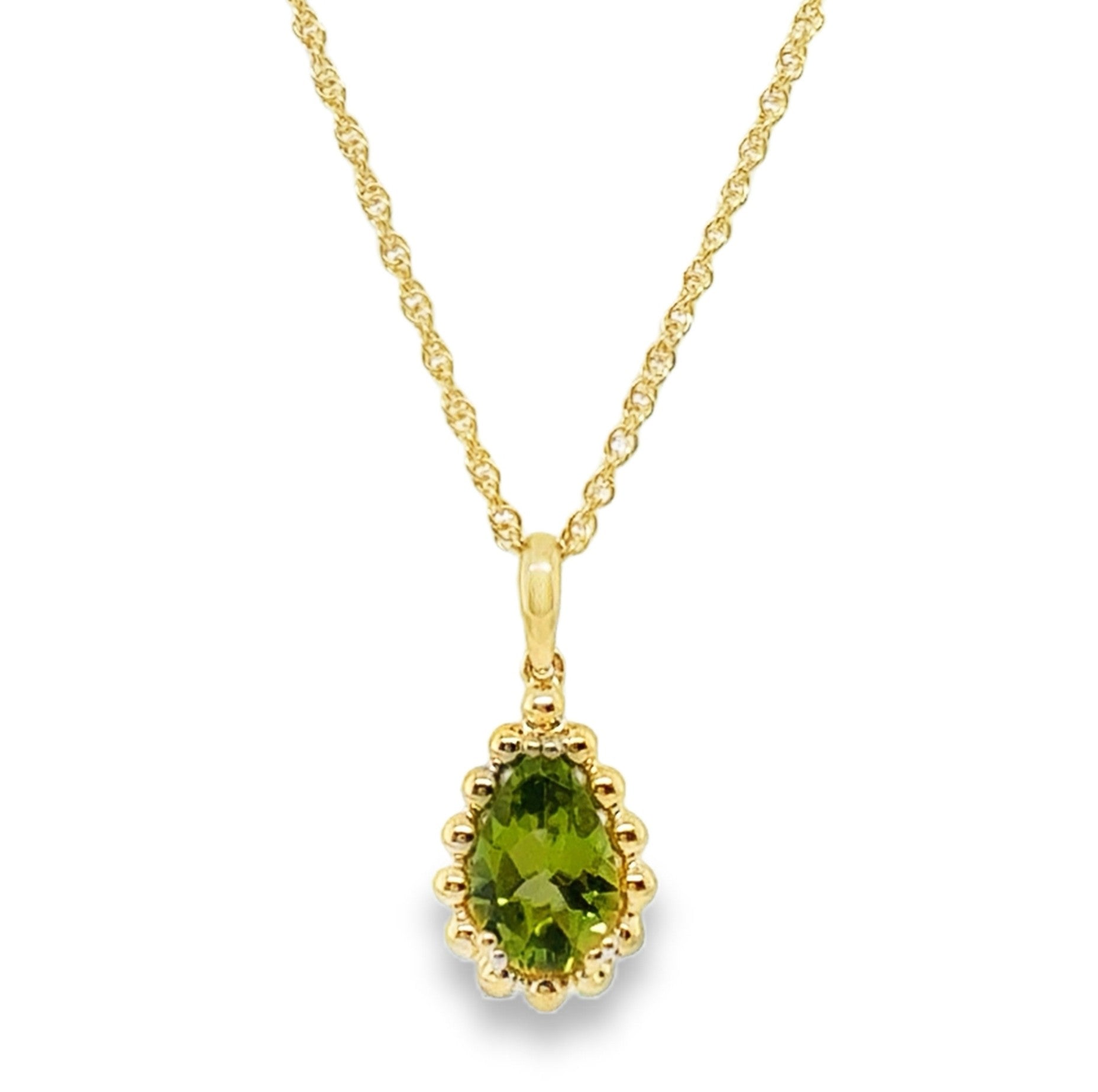14K Yellow Gold Pendant with Teardrop Peridot 1.30CT and Attached 18" Rope Chain with Lobster Clasp.