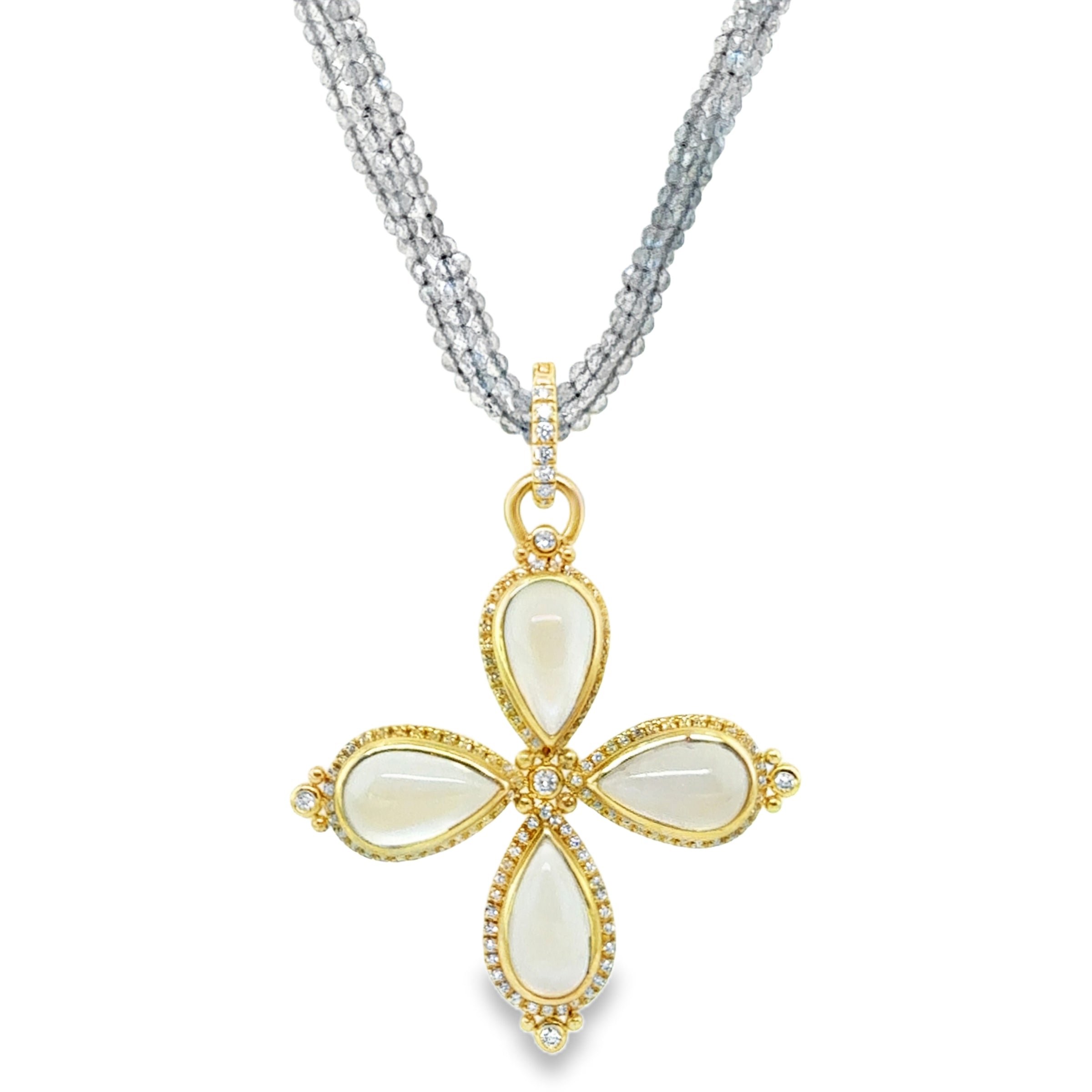 Labradorite Beaded 4 Strand Necklace with 18K Yellow Gold Cross Pendant Set with Moonstones and Diamonds D.91CTTW.